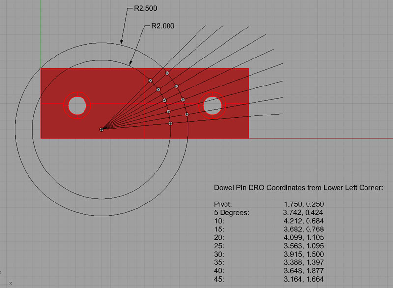 After cogitating on the idea of putting dowel pins in vise jaws (of which more below on how a fellow did that for another purpose), I did a Rhino drawing to figure out the placement of pins needed to provide a set of angle stops in 5 degree increments from 5 to 45 degrees: