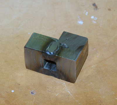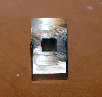 My plan was to do the old trick where you cut a square slot, and then "glue" two of those together to make a square hole. In this case, I took a 3/8" end mill, slotted the end of a piece I had squared earlier, sawed then end off, cut that part in two, and then Tig welded the result together. After grinding down the welds, I found the technique to be eminently workable: