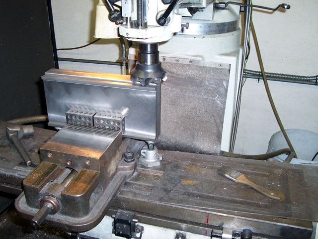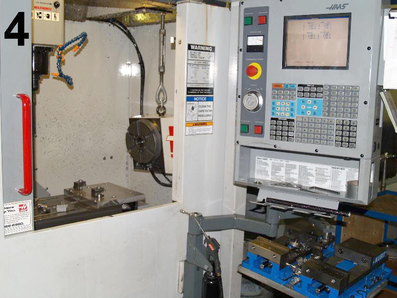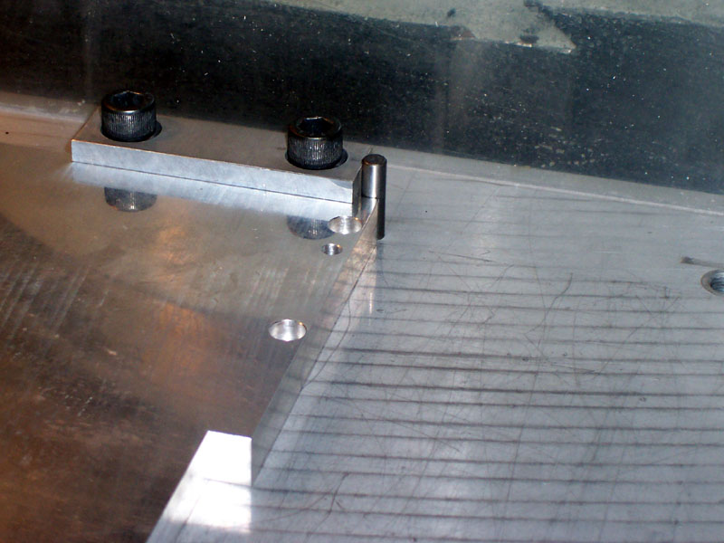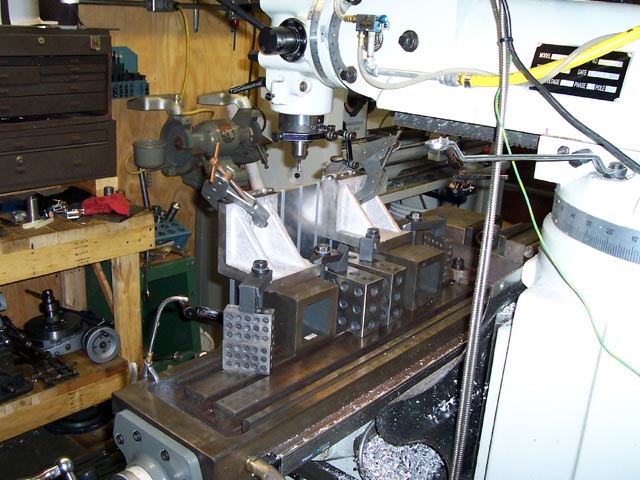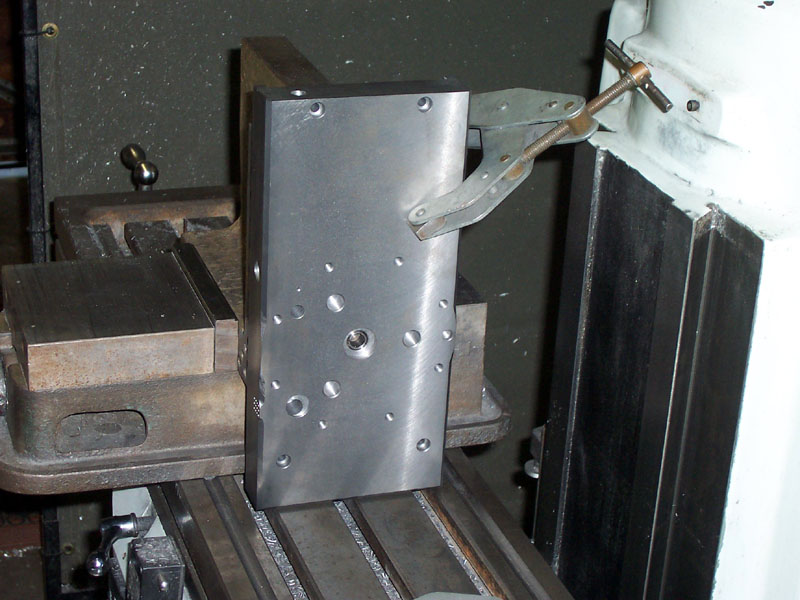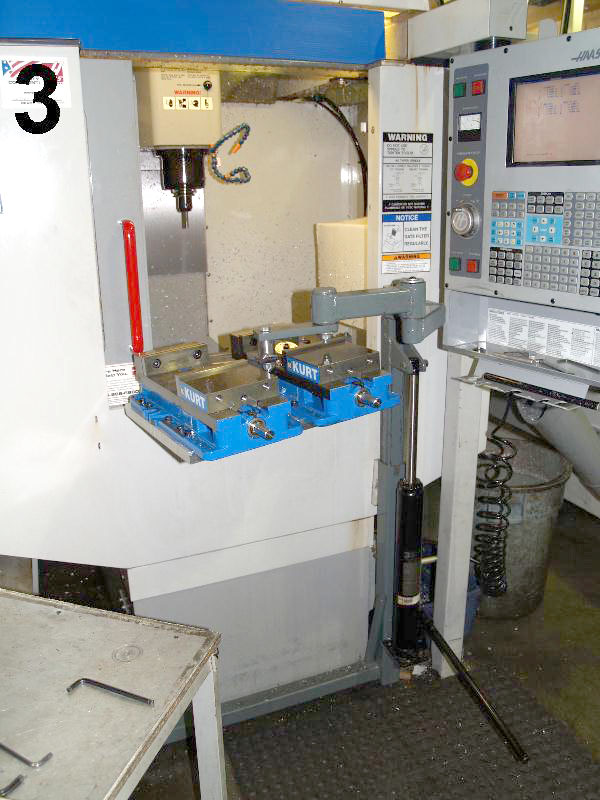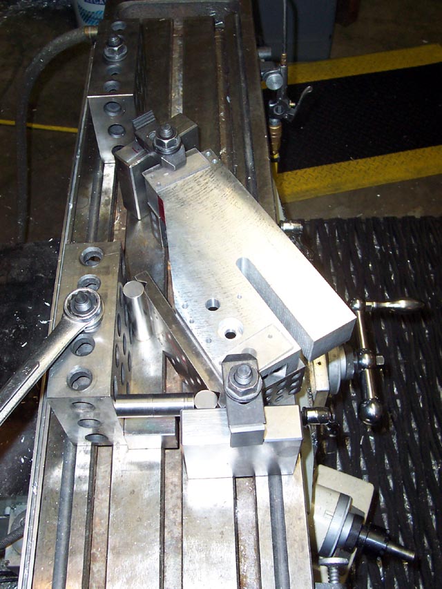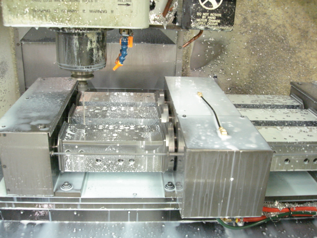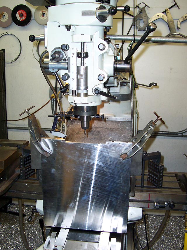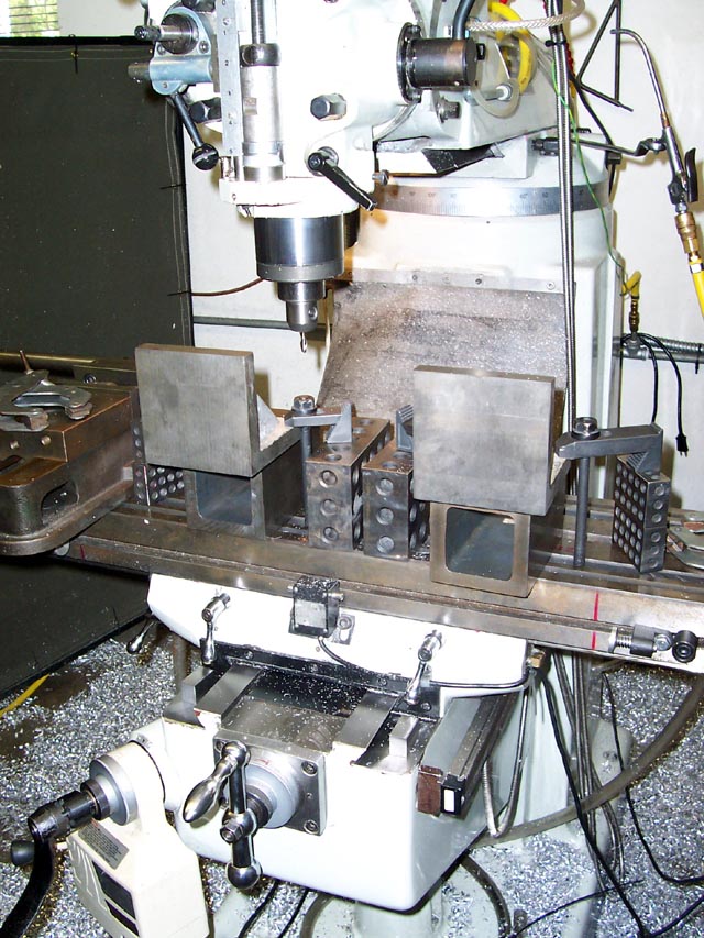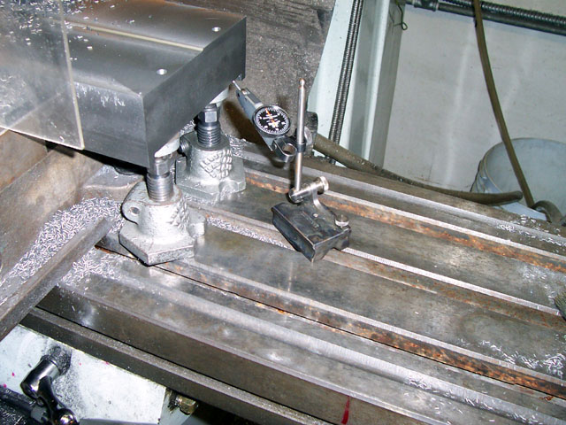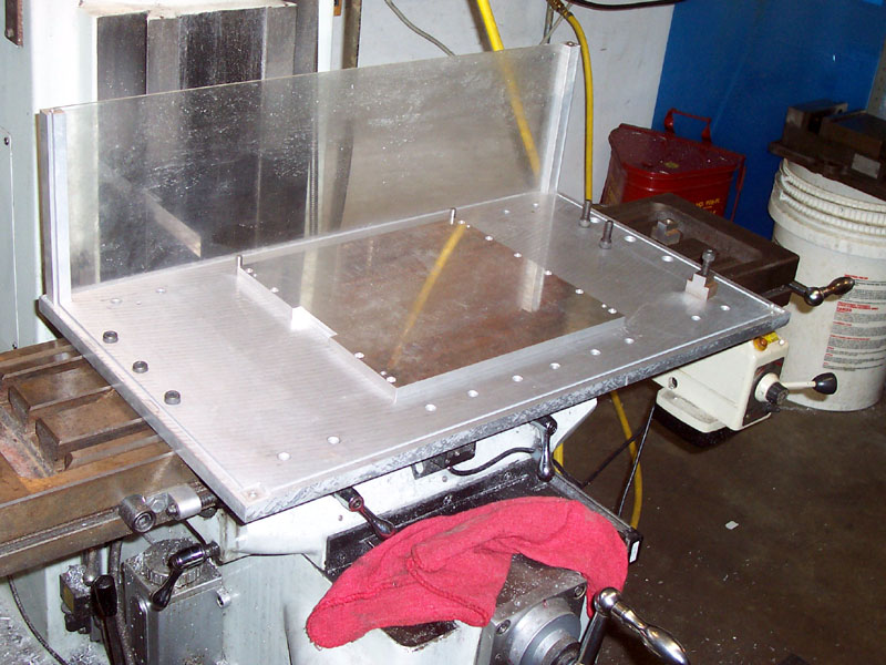 The Widgitmaster Enclosure being bolted down to mill table. Note the shiny plate is some work he will dial in. It is located against two pins at the rear.