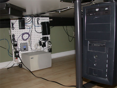 If you're like me, there is a gaggle of boxes and cables under your desk that are associated with your computer. There are routers, DSL modems, power strips, and every manner of wall wart power supply. It's scary to even go under there and try to plug a new one in or fix the old. Enter the pegboard under-desk organizer: