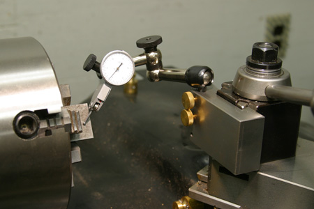 1. After rough aligning to the chuck rings, using a dial indicator on the work-piece, rotate the spindle through one complete revolution noting the highest and lowest indicator readings;