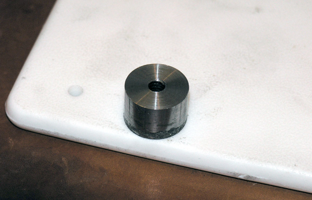 The second standoff was a write-off--the tap broke off before I was a quarter of the way into the hole. Doh! ?!@#$%!!! It was getting late, so I shut down the shop and went to bed. The next morning, as I was turning and parting a new stand off to try again with, it dawned on me that what I was cutting was something a lot tougher than 12L14. I decided to leave the power tapping aside and hand tap in the interest of moving through the project and because I wasn't too sure what I was dealing with.