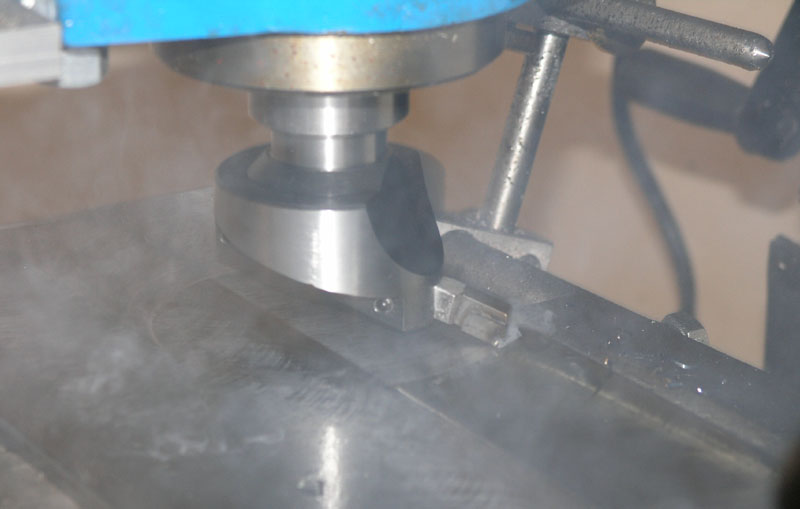 After a pass you can see the sort of Moire pattern you get. If the head is properly trammed square, both sides of the cutter evenly cut. They're not quite even here, so my head is slightly out of tram. Also note that I have to make two passes to get the whole width of the plate surfaced...