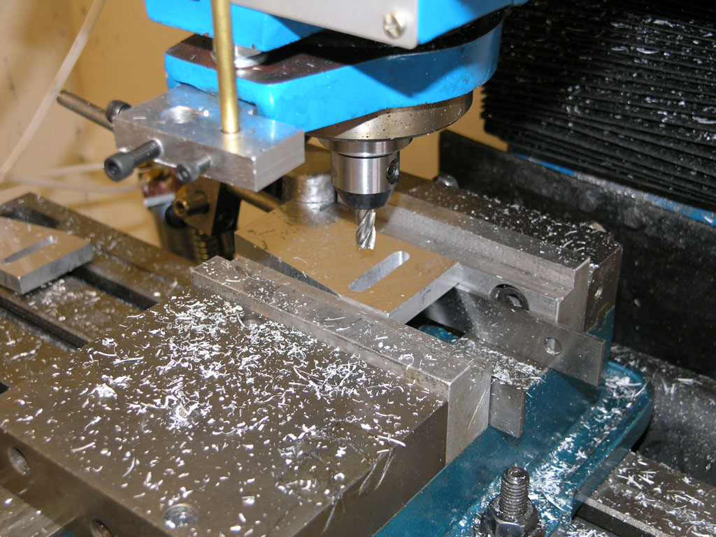 I slotted the base plate with a "corncob" 4-flute roughing end mill. My technique involves turning the quill and X-axis handwheels at the same time, mimicking the ramped cuts CNC machines make. You can cut a slot much faster that way than trying to plunge full depth.