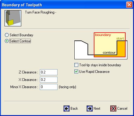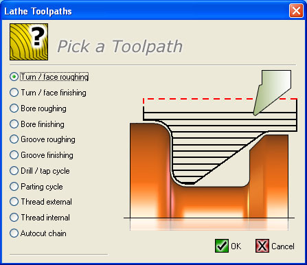 Now that it knows what toolpath you'd like, it's time to fill in the rest of the options. These come up as a series of dialog boxes, much like "Wizards" in other programs. The first thing to do is decide what lathe tool you'll be using: