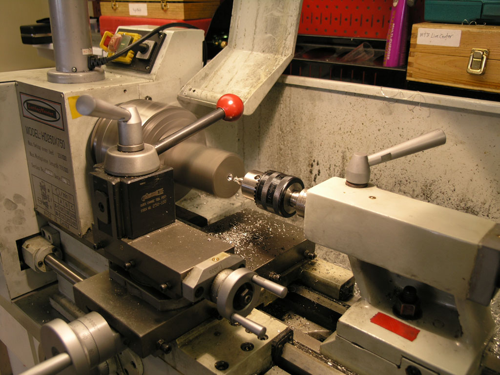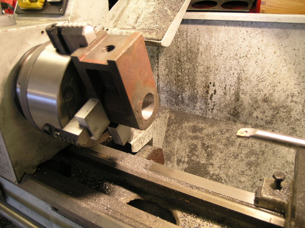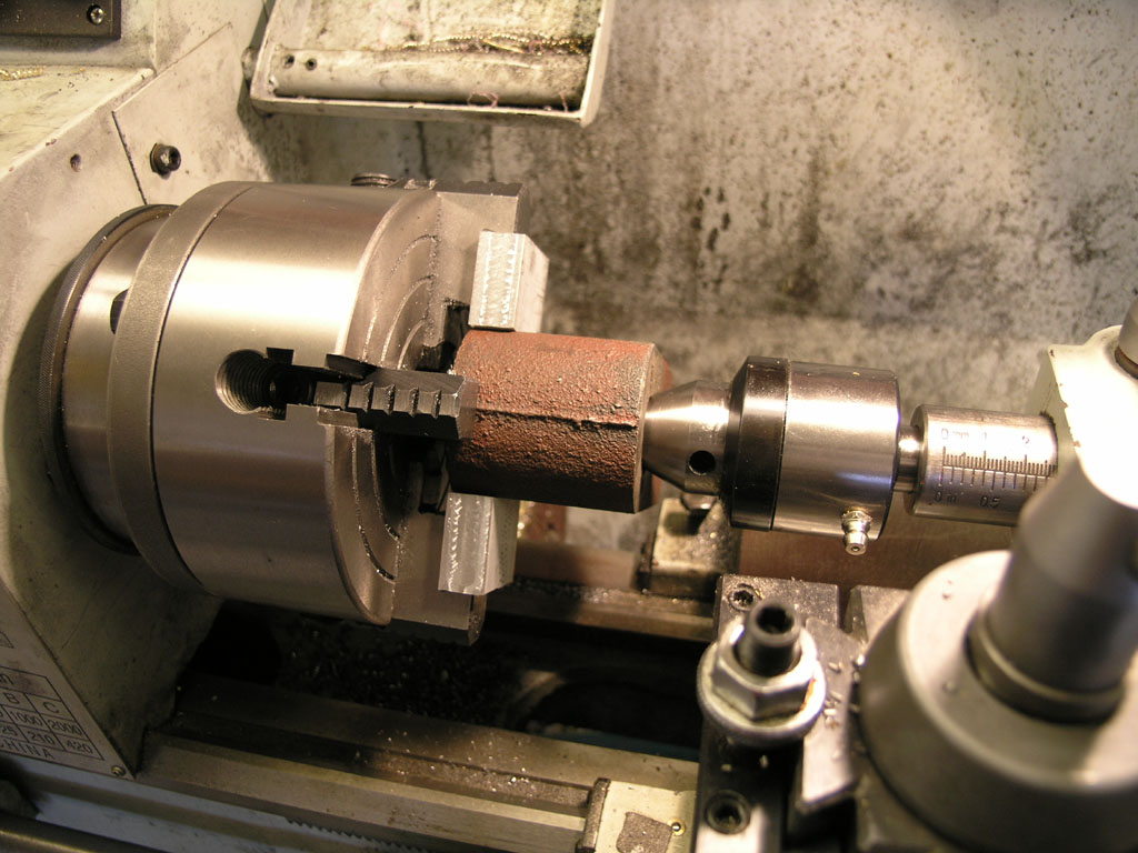First issue was to line up on the bore. Every surface is rough and far from precision. I settled for this method where I lined up using the cone of a live center. It was close enough!