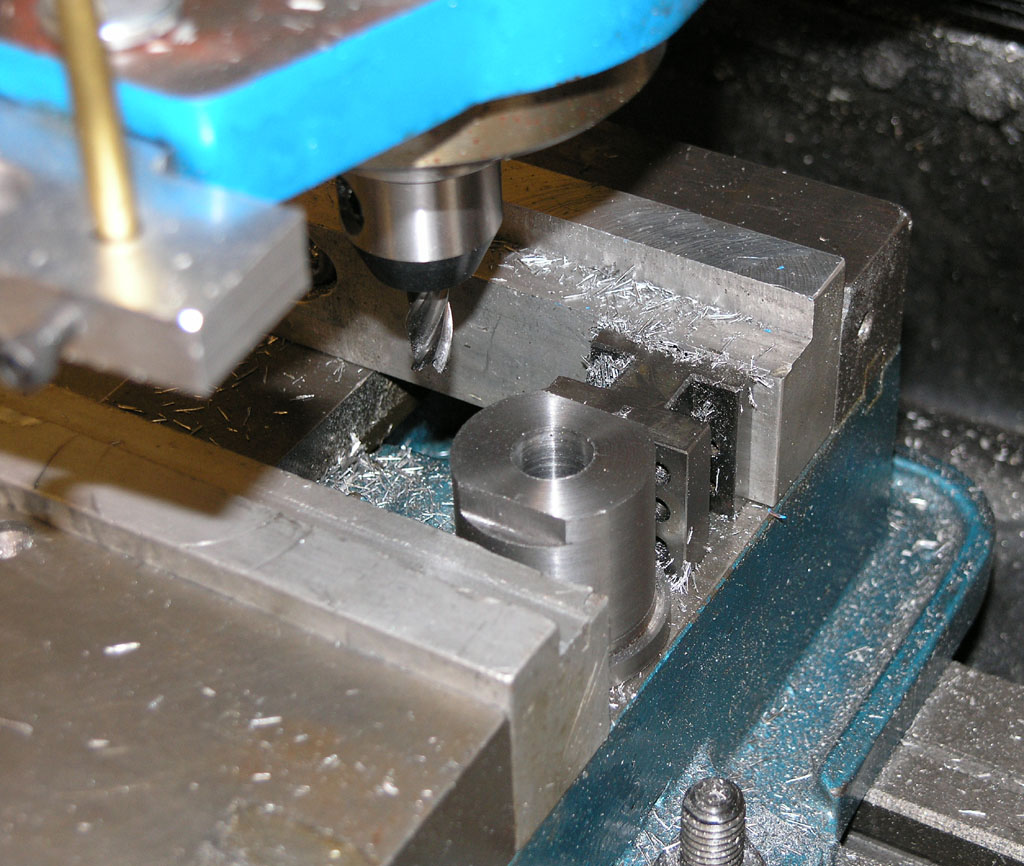 I didn't take pix of the counterbore on the other side. I used the coaxial indicator to line up the counter bore and a Silver and Deming bit in an R8 collet to drill it. Here I am cutting the flats with a 1/4" 4-flute end mill that mate against a slot in the ballnut bracket...