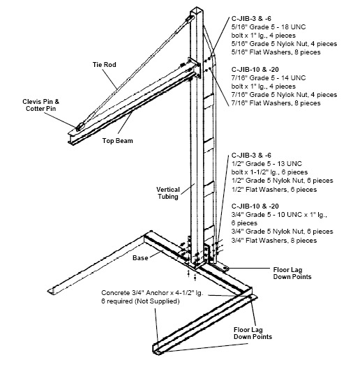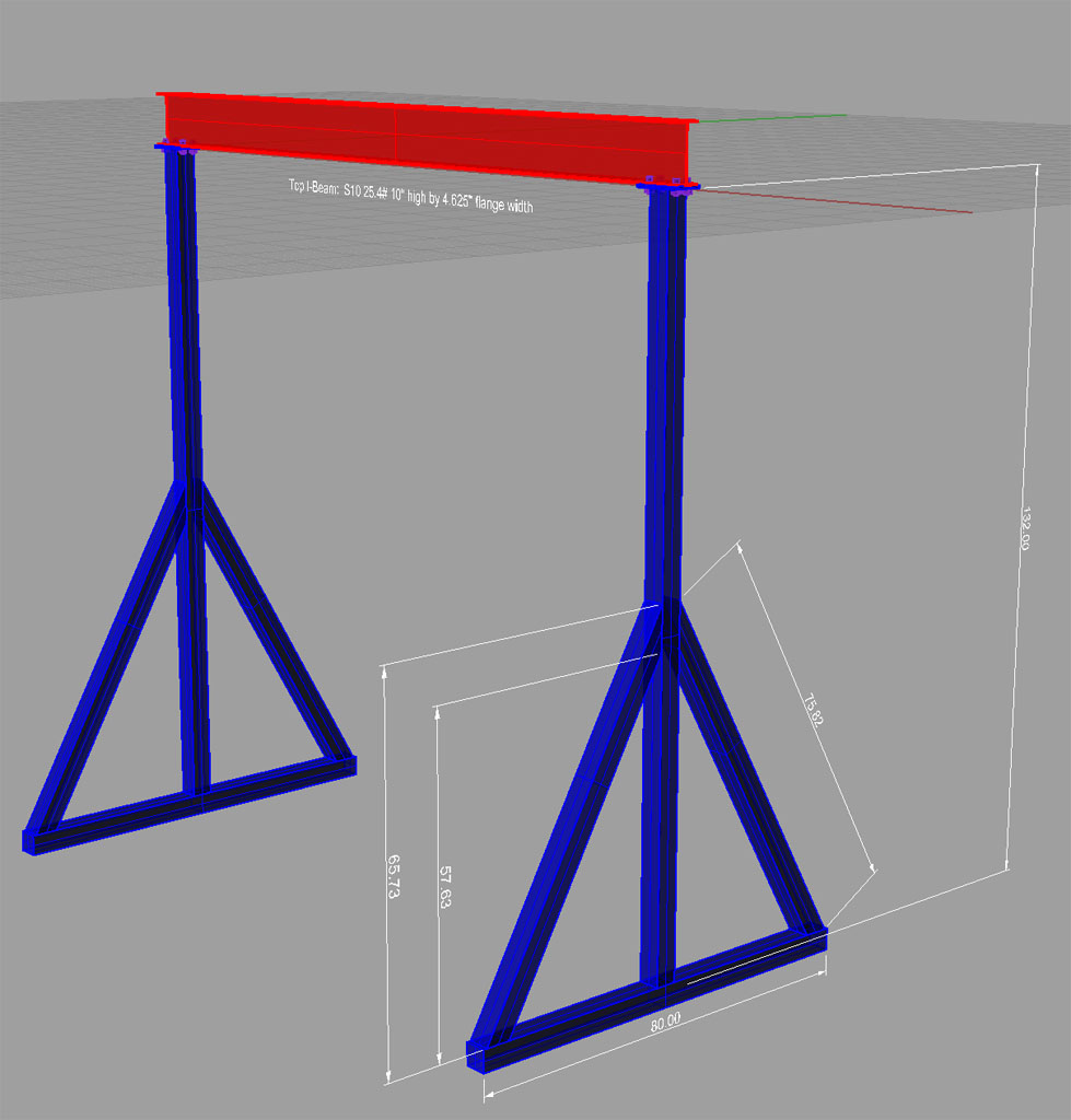 After looking at some of the options below, I settled on a relatively simple steel design. I followed the general dimensions of a commercial 3 ton crane by J. Herbert. This crane will be constructed with a 12 foot length of S10 25.4# steel I-Beam on top. The legs are 4" heavy walled rectangular tubing, which I have worked with before on my mill table. 3/4" Bolts hold the I-Beam to the legs. Here is the bill of materials for the crane: