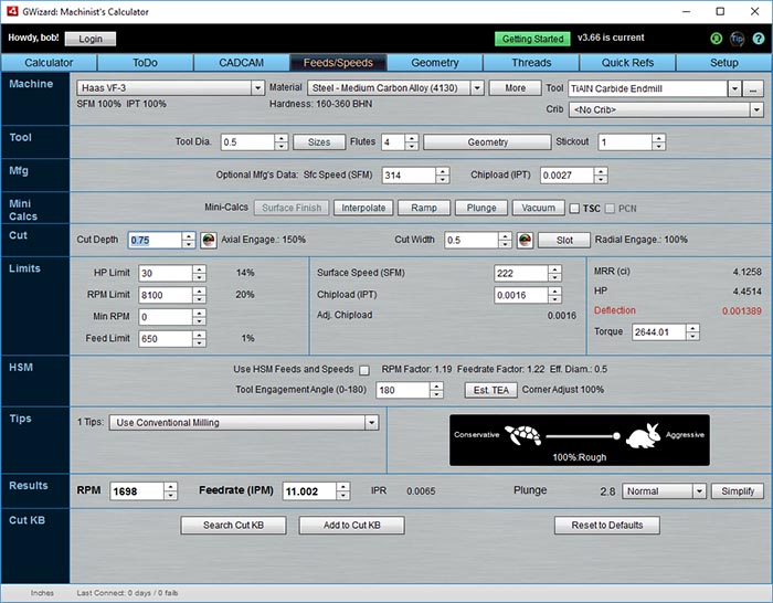 I've chosen to start here because if you have High Pressure Through Spindle Coolant on your machine, you know how well it works, and you'll want to take advantage of it. And, if you haven't considered it, you'll be surprised at how much it helps. G-Wizard has the ability to adjust your feeds and speeds to take advantage of several premium coolant options (Programmable Coolant Nozzles such as Haas machines often come with or that you may add via 3rd party are another).