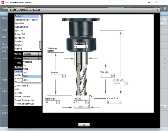 You want to click the "..." button right of the tool selector for a comprehensive set of tool definition options. Here you'll see the different tool types (more than any other Calculator in the business), Coating types (including PCD), optional Geometries such as Ballnoses, Chamfers, Corner Rounders and so on (again, more than any other Calculator available), and all the critical dimensions for the tool. This popup is the one-stop shop to define an endmill.