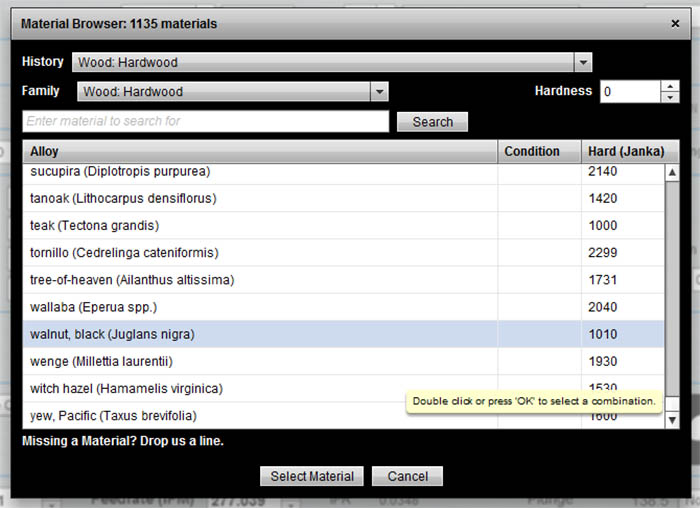 Generic material families are fine for Plywood or MDF, but if you've got a specific wood species, G-Wizard can fine tune for it. We've got a Hardwood (Walnut), so we start by selecting that family. Then click that "More" button just to the right of the Material Family dropdown: