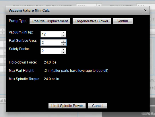 Lastly, you can enter a safety factor. I like a safety factor of at least 2x. G-Wizard's Mini-Calc says that with those parameters, each part is held down with 24 pounds of force. It suggest a maximum part height of 0.2. As the little note says, taller parts will have more leverage if you cut on top of the part to help pry it off your vacuum table.