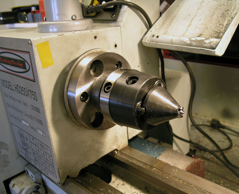 You can see here I had already milled the flats on either side and drilled the holes to mount the bracket to the Kurt vise. It was nice to be able to turn the whole thing for a nice finish in one shot. This sort of thing, albeit fantastically more expensive and sophisticated, is used in industry quite a bit. If you can reduce the number of setups or waste with such a thing, you'll make a lot more money on your job. In theory, the most accurate way to turn is between centers, and it is also important to turn between centers if you need to take the part off the lathe and put it back on while maintaining concentricity.
