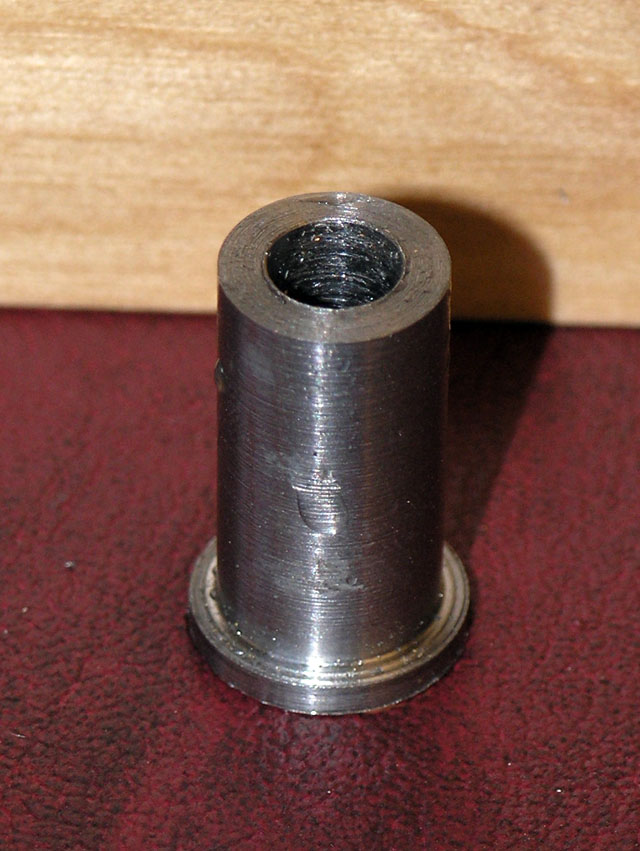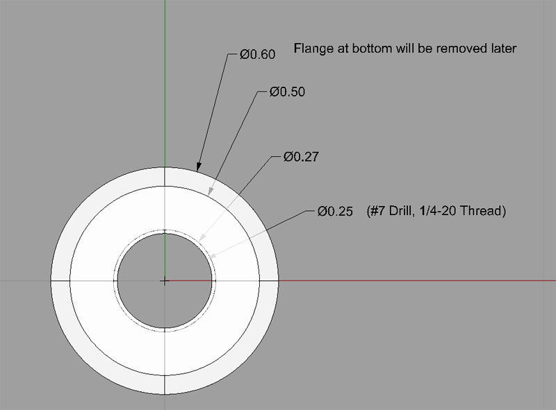I turned my stock to 0.600" OD, turned down the end to 0.500" to create the flange shoulder, center drilled, drilled a #7 hole (recommended size to tap for 1/4-20) full length, and then a slightly larger 0.27" hole for half the length, starting at the non-flange end. Parted it off, filed the parting flash, and voila: