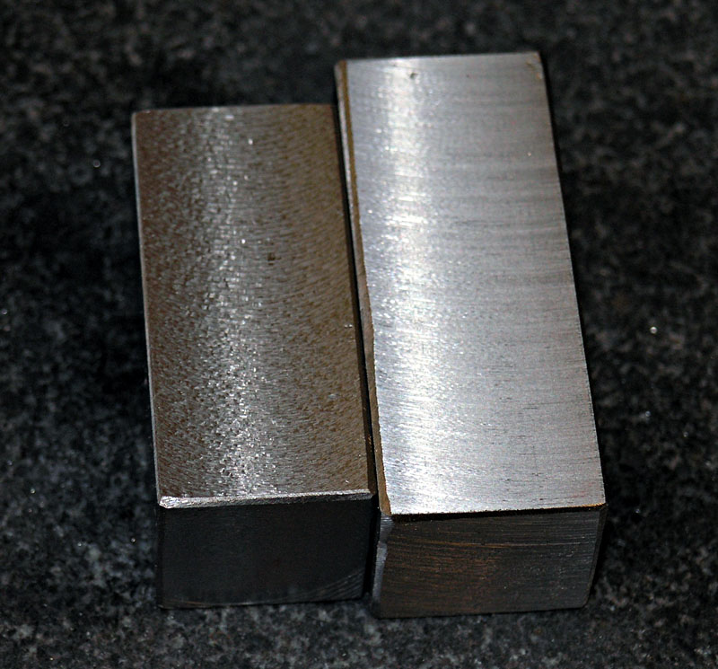 First, I squared up the blocks using 2 different cutters so I could compare their performance. Block on left is a 6-flute corn cob hogger. Block on right is a flycutter with brazed carbide lathe tool. More info on my surface finish page.