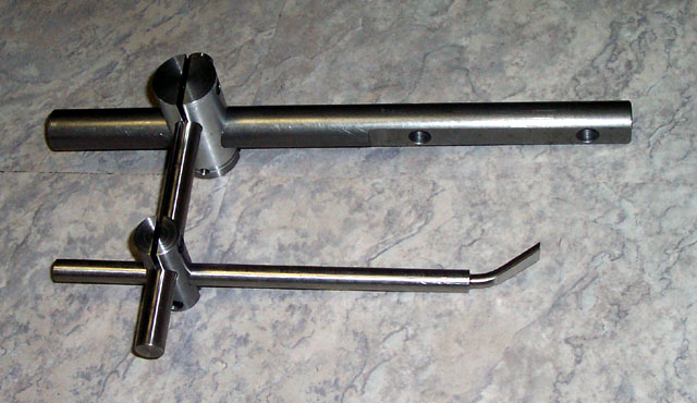 I am using progressively smaller rods as we move from the rear rod (bolted to vise), to the cross rod, to the stop rod. The rear rod is 0.770" in diameter. The cross rod is 0.5" in diameter. And, the stop rod is 0.25" in diameter. You will want to round the end, or perhaps point the end of the stop rod so it can act as a precise stop.