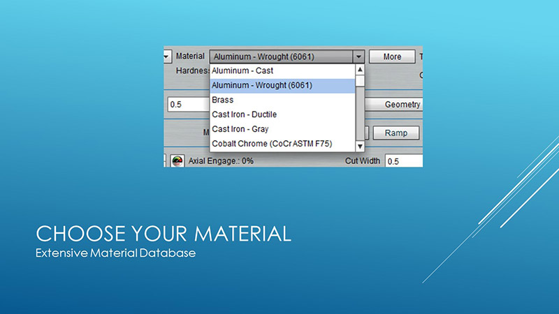 G-Wizard groups materials by family. You can fine tune for specific alloys with the More button. For now, just choose a family such as the 6061 Aluminum.