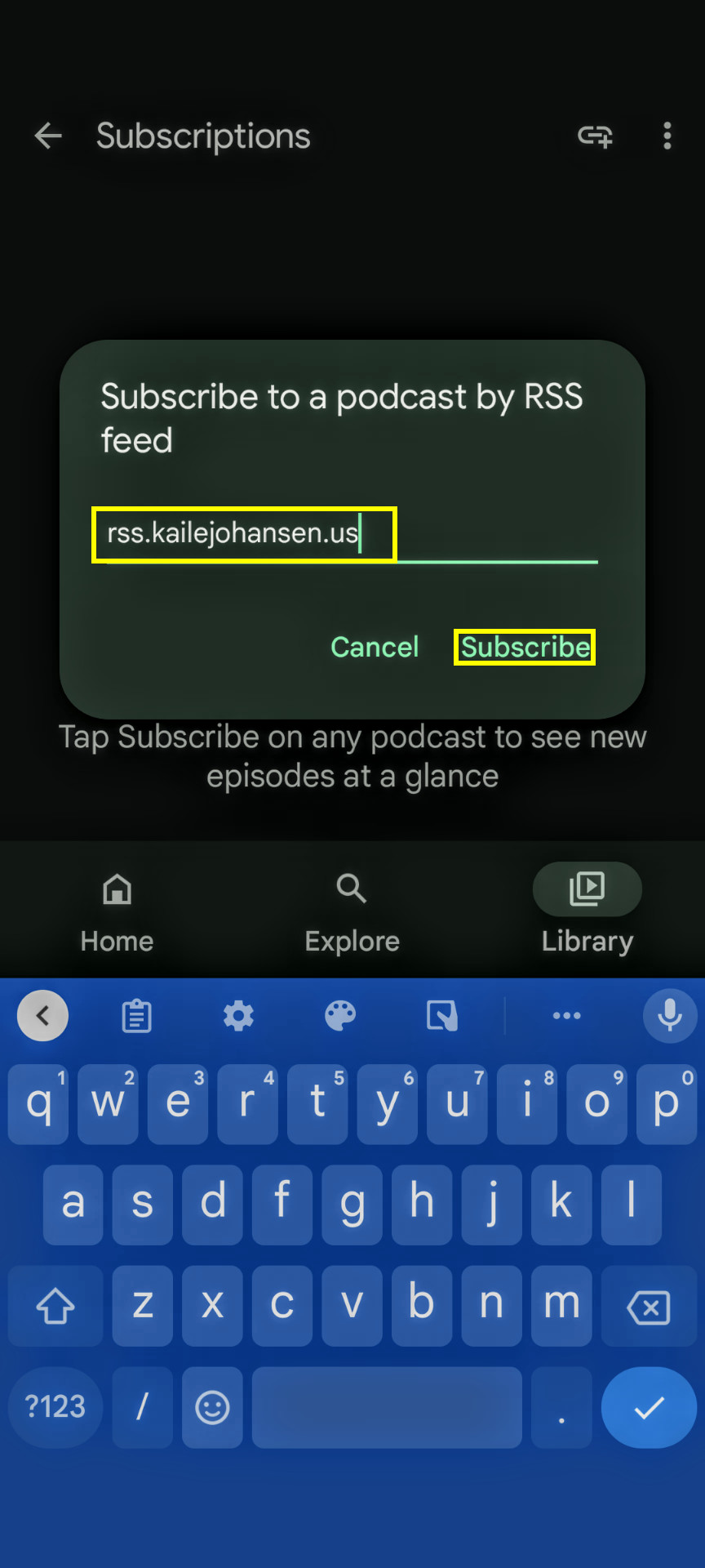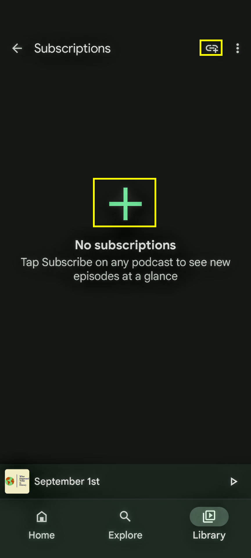 | Click on Library in lower right then click on subscriptions | click on the plus sign in the middle or the link icon in the upper right. | |