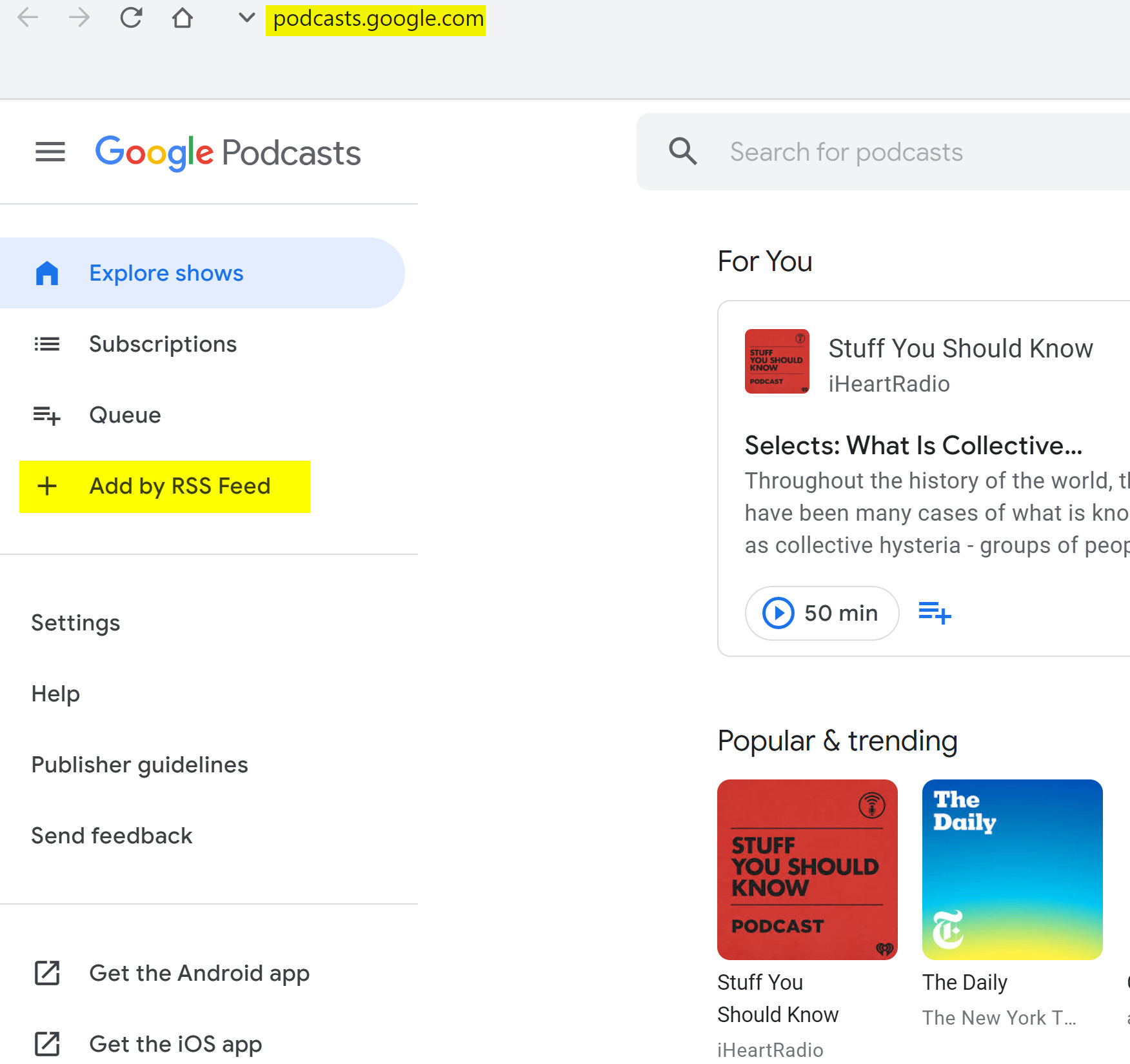 | on any computer point your browser to podcasts.google.com click on add by rss feed | type in "rss.kailejohansen.us" and then select the subscribe button | |