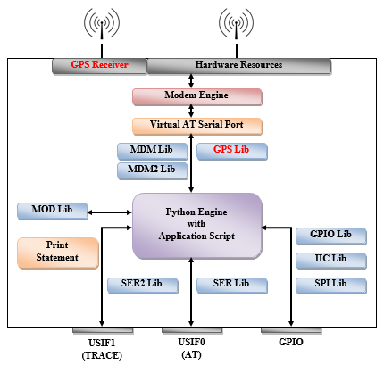 The Python script interacts with the Telit module functionalities through several built-in interfaces, as depicted below: