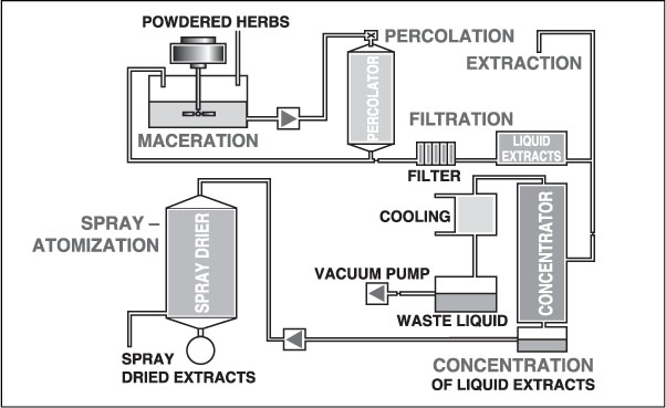 The extraction process begins with the maceration of the herb powder. This entails continuous mixing of the herb powder with a liquid extractant. The herb itself determines the liquid extractant that is most appropriate for complete removal of the active constituents.