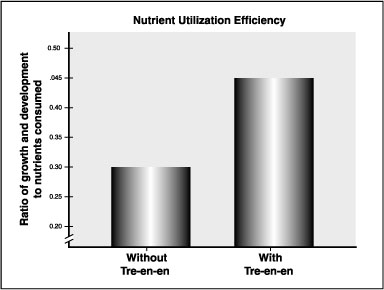 Compared to animals on a control diet, the animals fed Tre-En-En Grain Concentrates demonstrated superior growth, development and maturation, even though each test group consumed the same amount of kilojoules. This result indicates that the Tre-En-En-fed animals utilized nutrients from food more efficiently than did control animals.