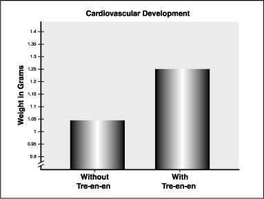 Animals on the Tre-En-En diet displayed greater cardiovascular development than did animals fed the control diet. Cardiovascular development (measured by heart weight) paralleled overall growth and development, indicating that larger animals were not “fatter” but instead were more fully developed.