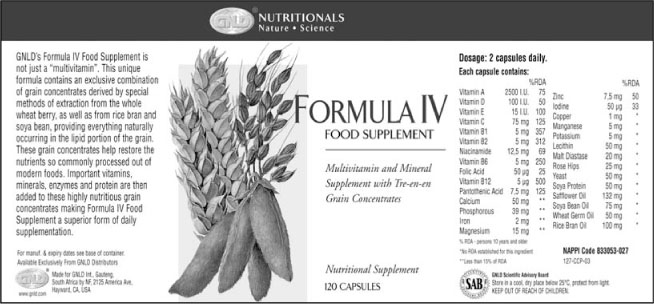 Formula IV Food Supplement differs from other nutrition supplements in that it is not just a “multi-vitamin”. It is a unique food supplement combining vitamins, minerals, protein, selected enzymes and lipids/sterols in a food concentrate formula. It is frequently imitated, but has never been successfully copied. This is due to GNLD’s exclusive use of Tre-en-en Grain Concentrates.