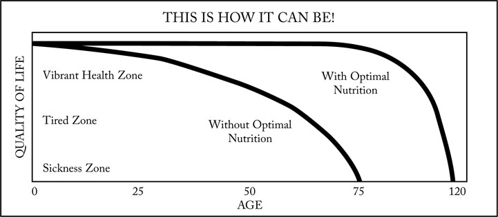 It doesn’t have to be this way! Today some of the world’s leading scientists are convinced that poor nutrition contributes to every one of these diseases! Poor nutrition and other unhealthy, unbalanced aspects of our lifestyles are robbing us of the ability to achieve our theoretical biological potential of 120+ years. Most of us are losing decades and spending way too much time in the zone of declining health. Barring infectious disease and accidents, there’s no reason why large portions of the population can’t live to be over 100. But the issue is not just adding years to your life - it’s adding life to your years!