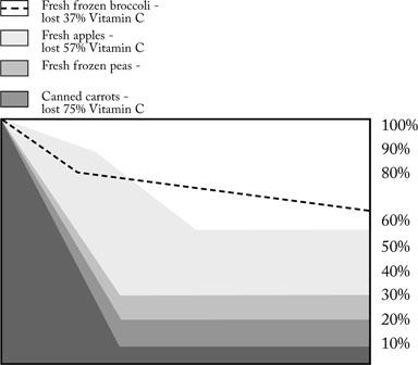 This chart graphically depicts the dramatic nutrient losses that take place in our food from the time of harvest through various stages of transport and storage until it is placed upon our table