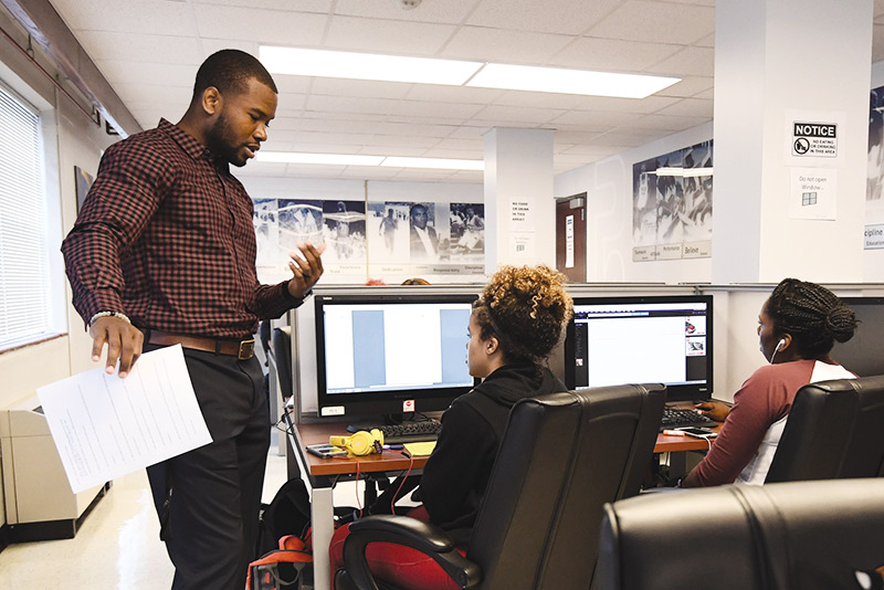 Academic services graduate assistant Kenita Stokes checks in with students in the computer lab, which has 28 work stations.
