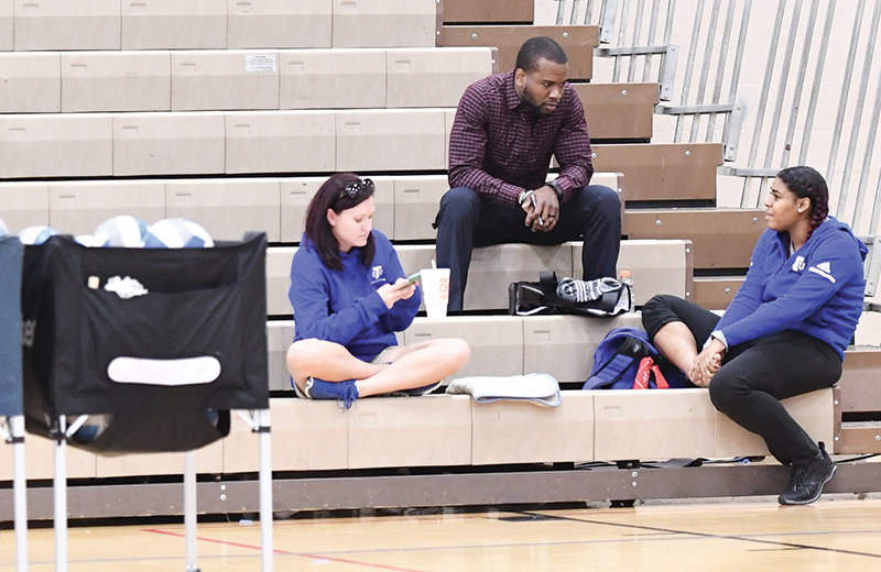 Jeremy Perry counsels a student-athlete while recent graduate Raven Davis (left) chats with her former track and field teammates.