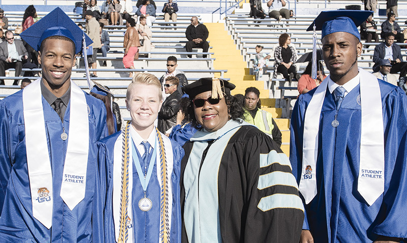 Johnnie Smith (second from right), formerly associate director of academic services, joins graduates wearing their student-athlete sashes at the 2017 commencement. Tennessee State University photo