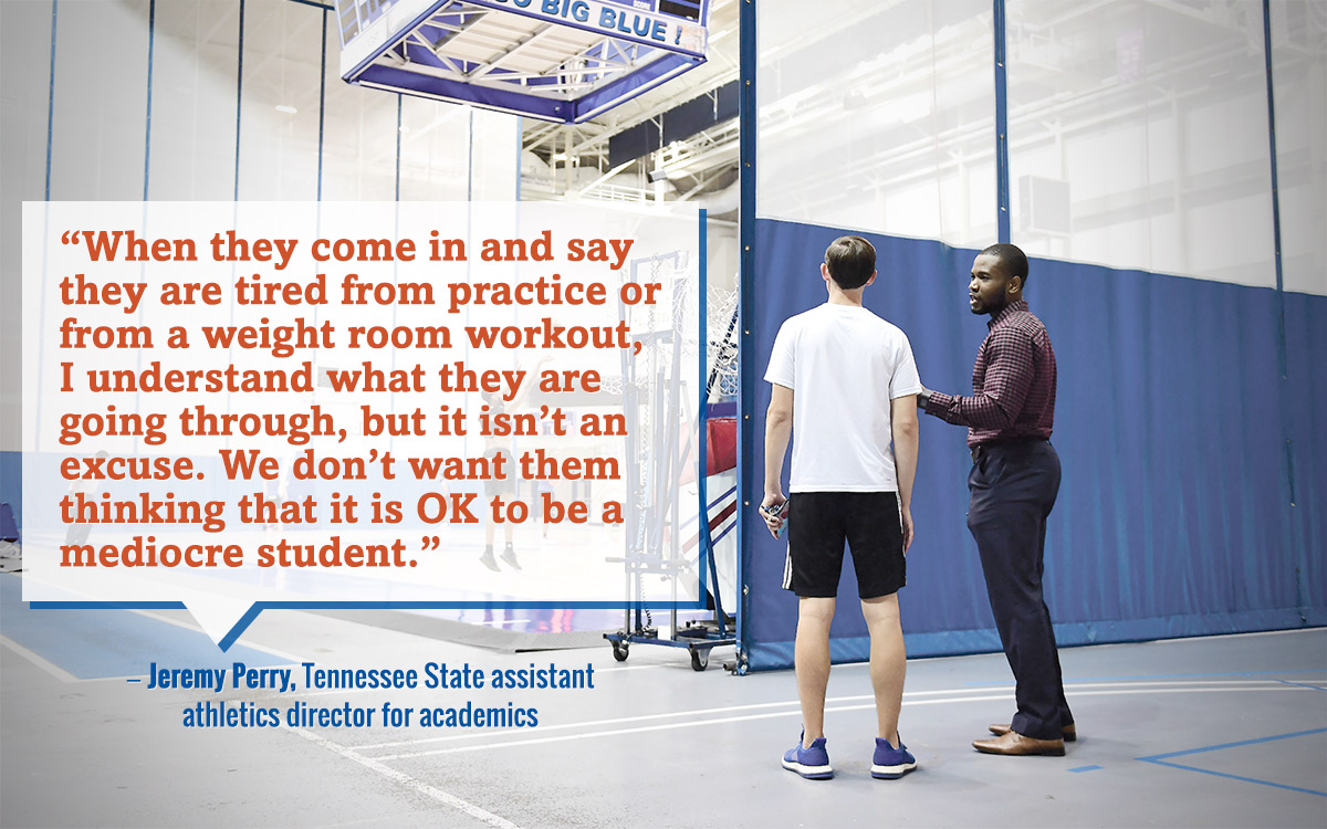But like many schools, those extra resources are a luxury for Tennessee State. When Perry was playing there, the academic support services team operated from a basement. The space wasn’t conducive to creating great study habits. Privacy was nonexistent. It wasn’t a setting where everyone could do their best academic work. So perhaps it wasn’t a coincidence that, in 2011-12, four of Tennessee State’s teams fell below the minimum Academic Progress Rate score of 930 that programs must meet to be eligible for NCAA championships.