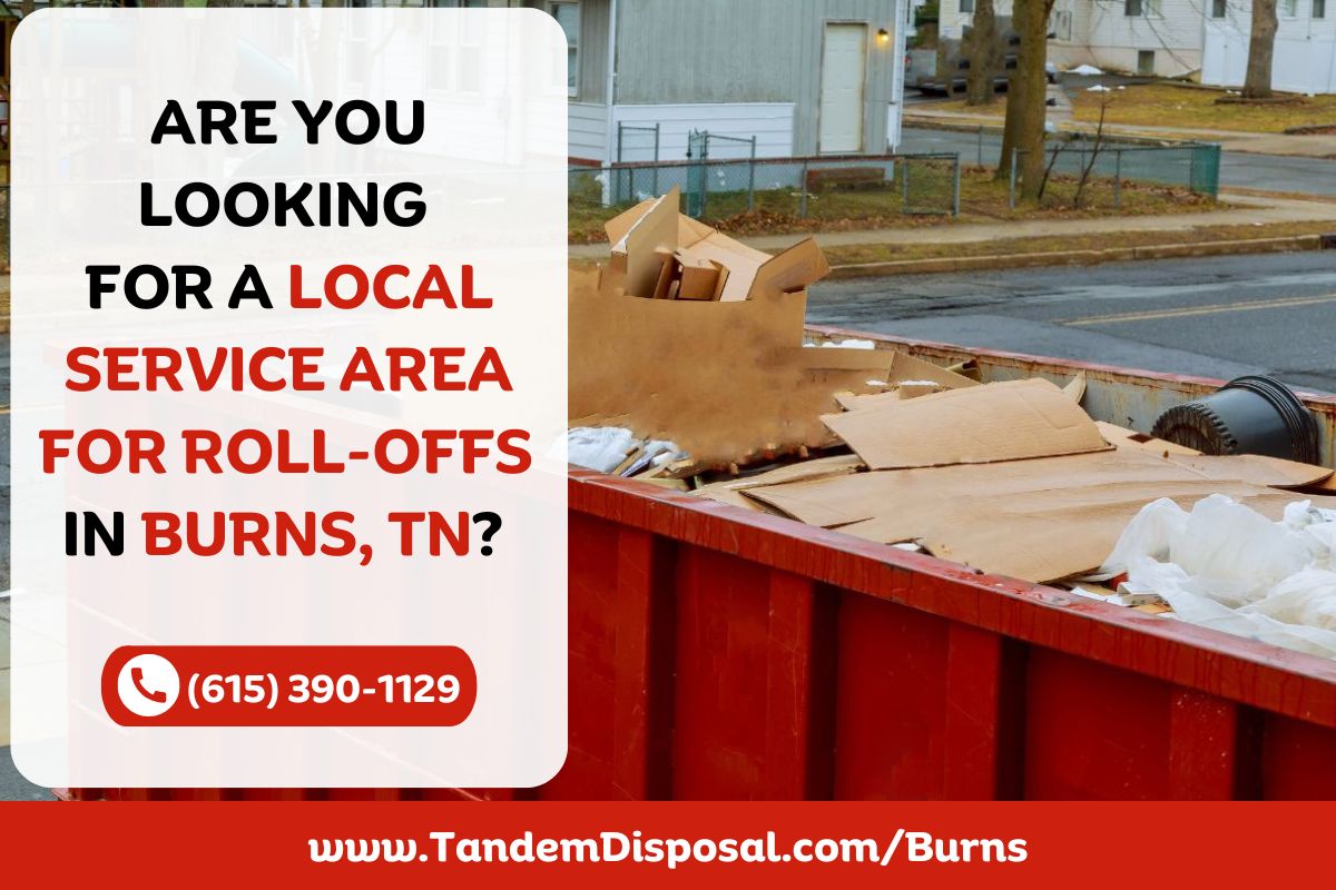 Our local service area for roll-offs in Burns is built around dependable access and community support. We’re proud to serve Burns, TN, and nearby neighborhoods with timely roll-off deliveries and consistent follow-through. Tandem Disposal has deep roots in the area, which helps us provide a personal touch and a responsive experience for each customer. When you work with a local team, you get more than convenience — you get care from knowing the community firsthand.