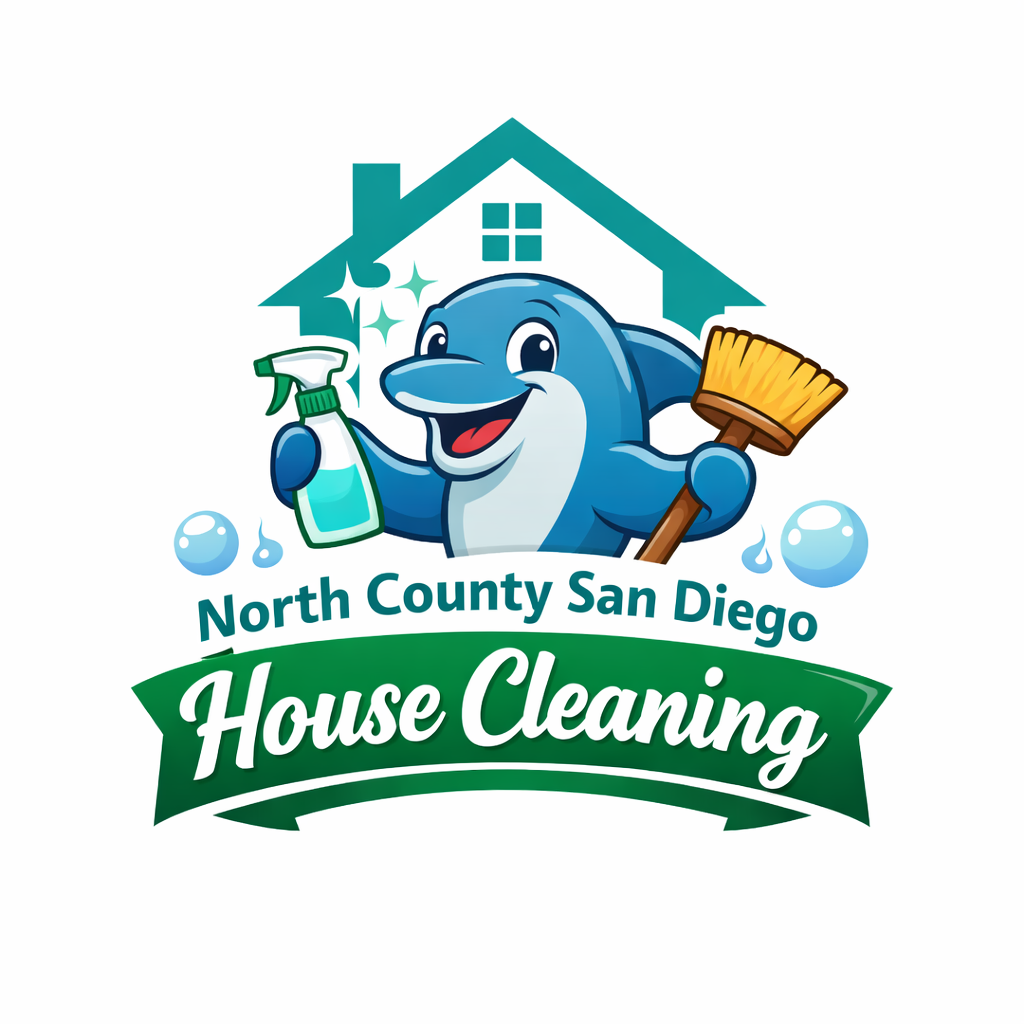 Based on the content provided, this is the website for a residential and commercial cleaning service company operating in North County San Diego, California, named North County San Diego House Cleaning. The business presents itself as a professional, established service with over 25 years of experience in the local community. A distinctive and recurring visual element across the site is a logo or graphic featuring a dolphin holding a spray bottle and a broom, which serves as a unique brand identifier. The company's stated mission is to elevate home environments through professional cleaning solutions, aiming to provide customers with more time and reduced stress by handling their cleaning needs.