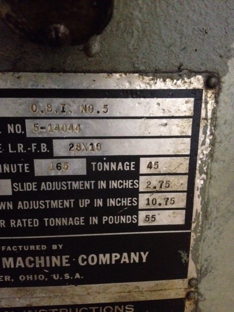 45 Ton Minster O.B.I. Press For Sale Posted on by Dev 45 Ton Minster O.B.I. Press For Sale Model: #5 Year: 1963 Capacity: 45 Ton Slide Adjustment: 2.75″ Shut Height: 10.75″ Speed: 165 SPM Bed Area: 28″ x 18″ Share this:Click to share on Twitter (Opens in new window)Click to share on Facebook (Opens in new window)Click to share on Reddit (Opens in new window) Related