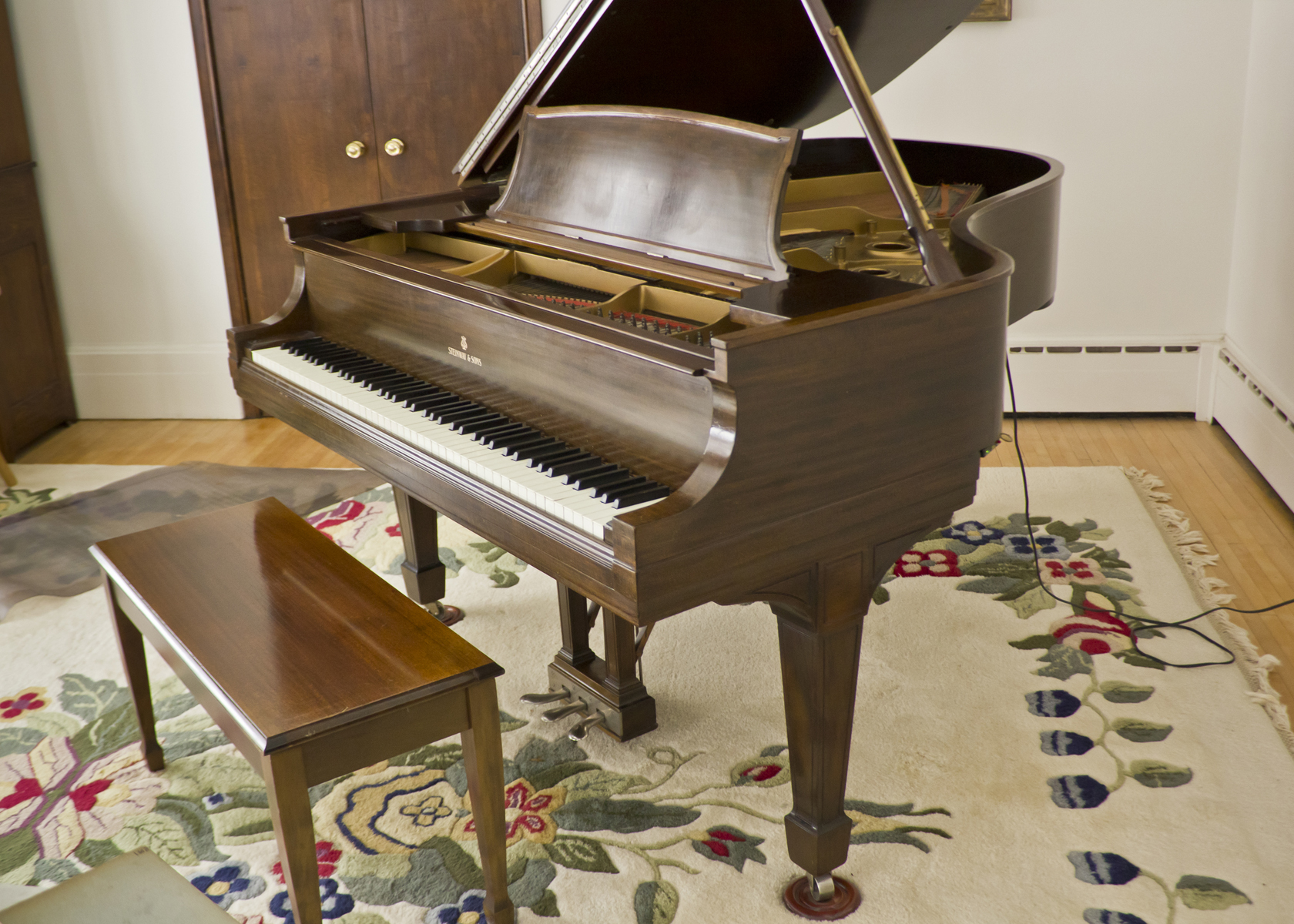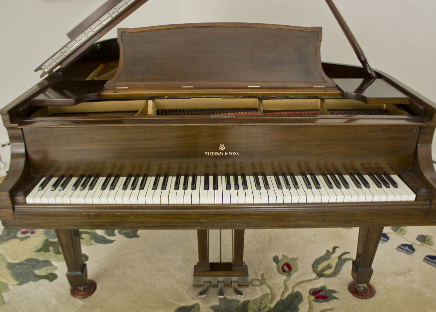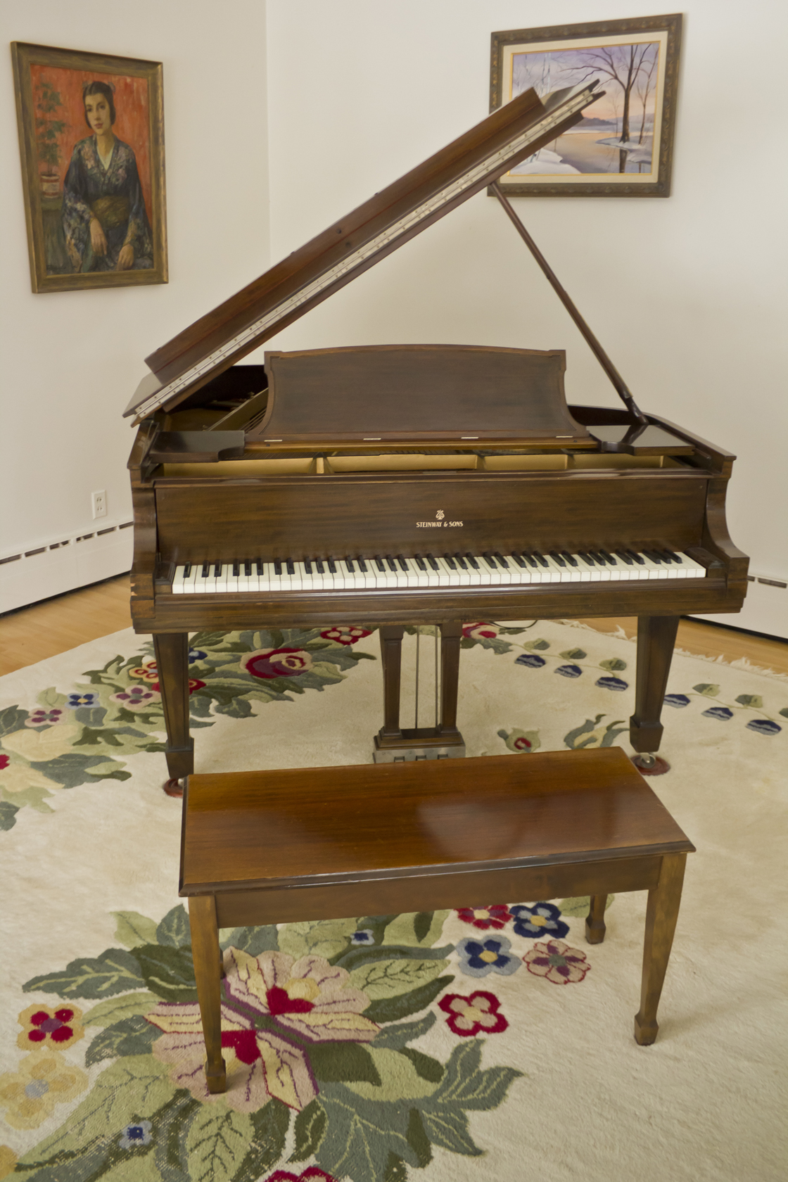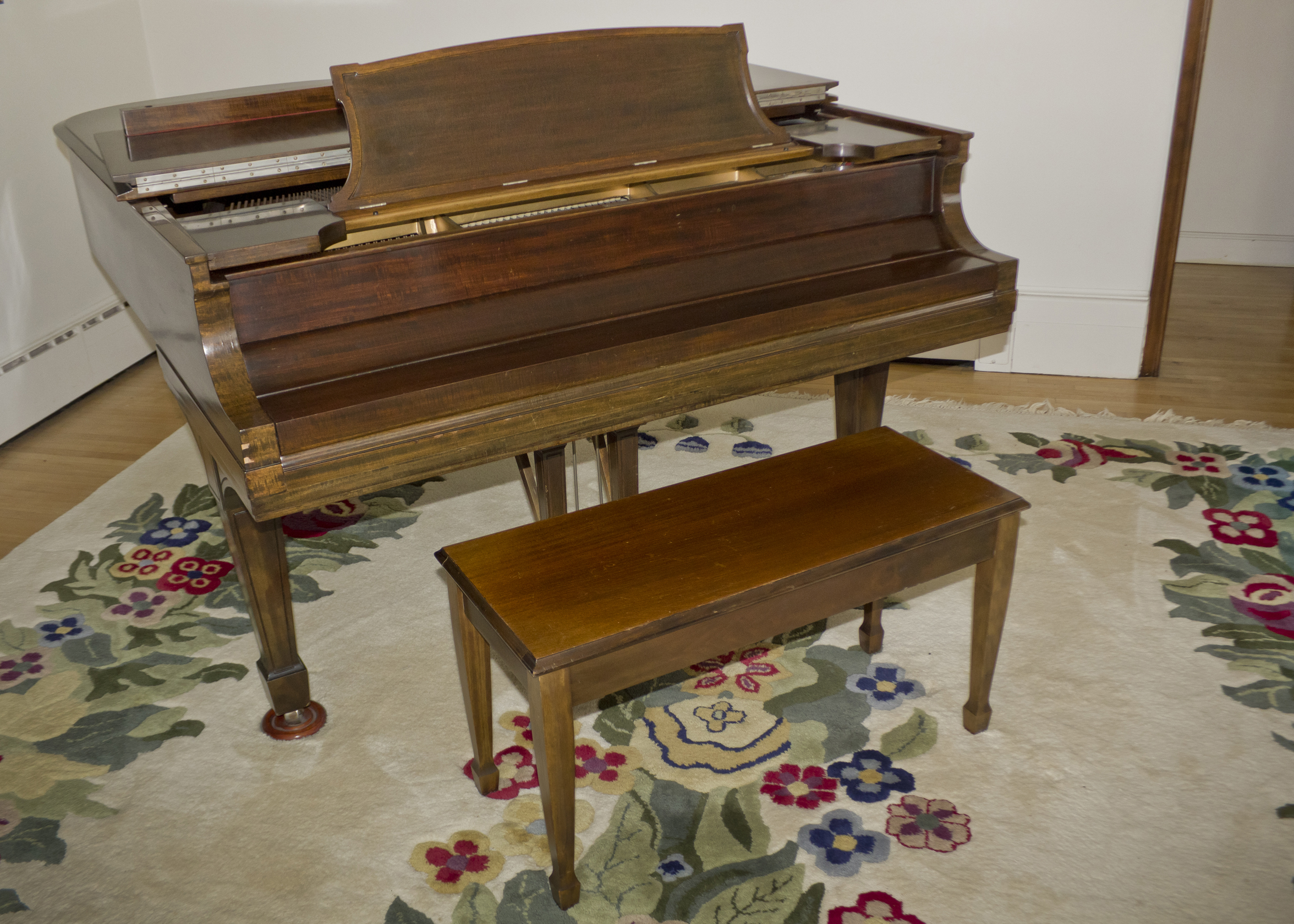 - Manufacturer: Steinway, Model L grand piano 5’ 10” with seat