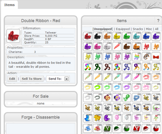 Tailwear: This contains all items that can be worn on your pony's tail. Ribbons can be found in here.