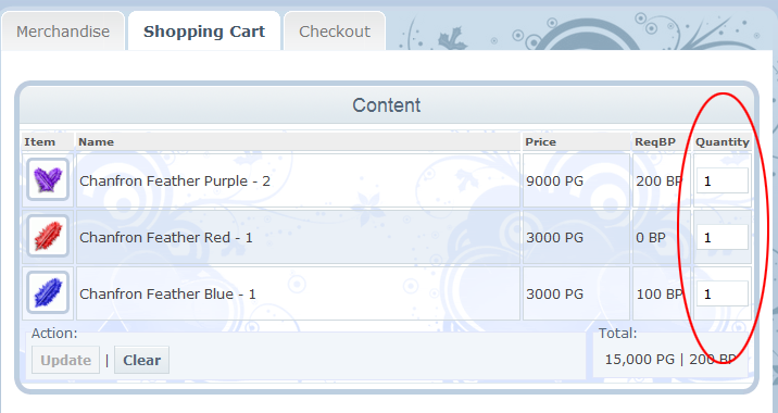 Clicking update will not only update the quantity of items you are purchasing, but will also update the total PG it will cost you to purchase the items in your cart.