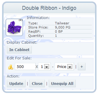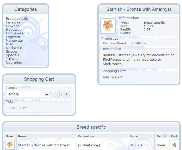 Purchasing items means that you pay PG for it just as you would a pony. Also much like a pony, items being sold by other users can be placed up for buy or bid. You can purchase items from either the site Store, or from other users.