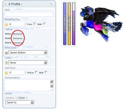 If you don't like the tattoo your pony has, you can remove it by hitting the "Remove" buttons for each slot under its profile.