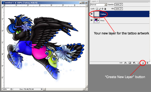 2. Create a new layer on top of the layer with your pony's image in it. This is where your tattoo artwork will go. Make sure to keep your artwork within the area outlined by the location guide, or else it won't show up on your pony!