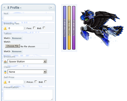 Under your pony's profile click "Edit" and you will be brought to a screen where you can update their presentation, put them for sale or breed, and tattoo them. Tattoos go into three slots shown below,