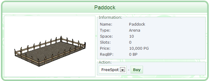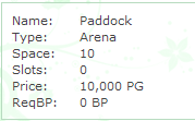 As you can see, the arena page is very similar to the enclosures' page. Much like the stables' page, you will notice the same 6 informative areas on each arena: Name, Type, Space, Slots, Price, & ReqBP. Below is a brief description of each one: