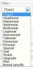 Here you have multiple choices. As always, the search will automatically default to [Type] which means when you are searching, the system will look through all categories of items. If you would like to narrow down your search further, you have the following choices in doing so: Headwear, Manewear, Neckwear, Bodywear, Legwear, Hoovewear, Tailwear, Facewear, Finwear, Special, Suit, Snack, Upgrade, Misc, and Breed Specific.