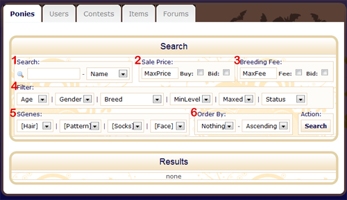 Here you can choose to search only for ponies that are up for Buy and/or Bid, as well as the maximum price that you want to spend. Want to go shopping but are on a budget? Just enter the maximum amount that you can spend here.