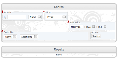The items search functions the same way as all the other options, but adds back in the element of purchasing. Here you can look for items by their type, their price, or simply by who owns the item, or is selling the item.