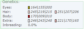 Extra: This tells you in lettered (HEX) or numbered (DEC) code what color your pony's extra slots are. Extra slot colors vary depending on the breed of the pony. Some breeds do not use their Extra 1 slots while other breeds do. Extra 2 will always be the color of a visible colorized gene. To learn more about genes, please visit the Genetics section of the Breeding tab.