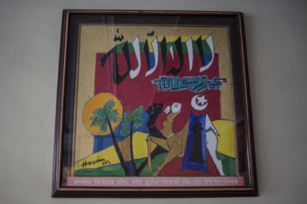 A painting by M.F. Husain, a famous painter from Ahmedabad and friend of a partner that started the restuarant hangs in the restaurant. The urdu words in the picture say “kalma” and “God is one.”